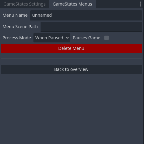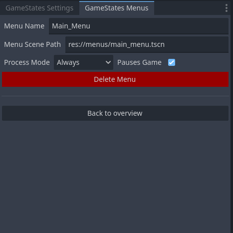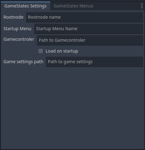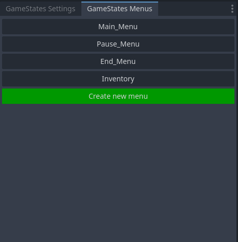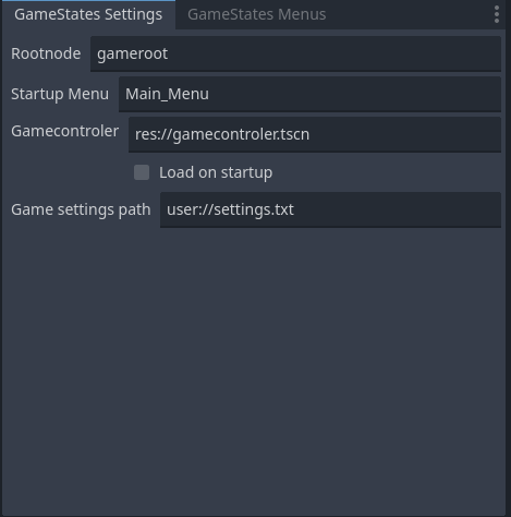 Gamestate.load_menu("menu_name") from GDScript (the menus have to be created in the FGS Menus tab first)Gamestate.unload_menu()Gamestate.register_setting(...), Gamestate.get_setting(...), Gamestate.change_setting(...) and Gamestate.unregister_setting(...)Gamestate.register_shared_value(...), Gamestate.get_shared_value(...), Gamestate.change_shared_value(...) and Gamestate.unregister_shared_value(...)